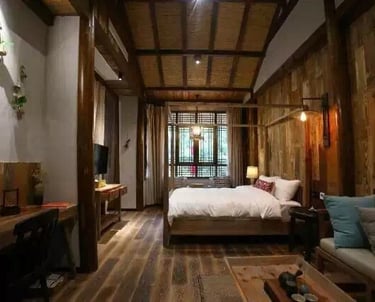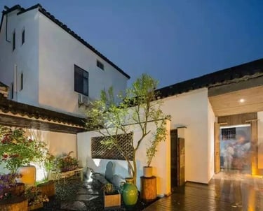 Nestled in the heart of Shanghai, this luxury villa embodies a harmonious blend of traditional Chinese aesthetics and modern comforts. The exterior features elegant gray brickwork, adorned with intricate wood carvings and ornate roof eaves, reminiscent of classic Chinese architecture. Lush gardens surround the villa, filled with carefully manicured bonsai trees, koi ponds, and tranquil stone pathways, creating a serene oasis amidst the urban bustle.