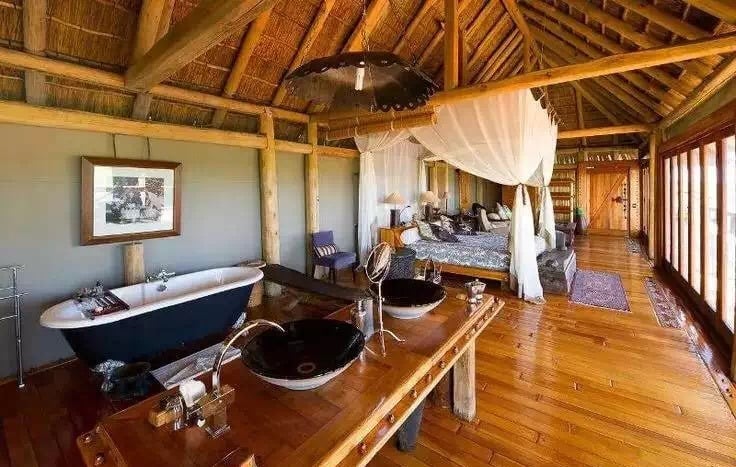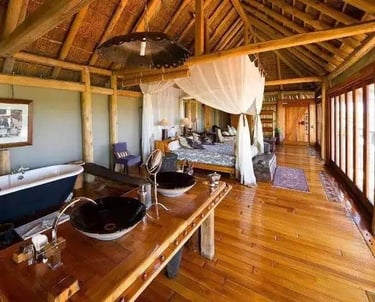 This interior features a luxurious and rustic design with a natural, open-air vibe. The thatched roof and exposed wooden beams give it a warm, earthy feel, while the polished wooden floors add a touch of elegance. Large windows along one side allow ample sunlight to flood the space, enhancing the natural aesthetic and providing beautiful views.