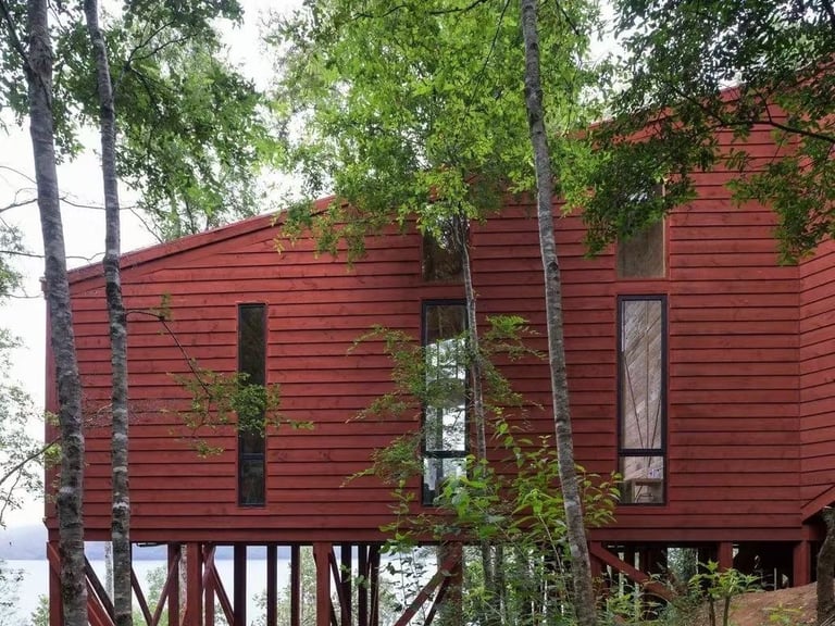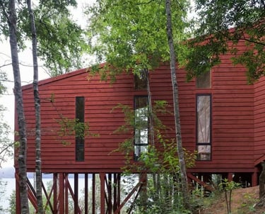 This summer cabin features a warm, rustic wooden exterior with a cozy, inviting look. The light red-brown wood paneling gives it a natural charm, while the timber-framed windows add a touch of simplicity and brightness. The cabin is surrounded by a wooden railing, creating a small porch area, perfect for relaxing outdoors.